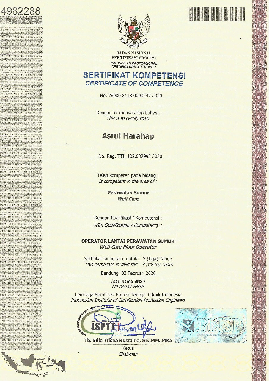 | Skema Sertifikasi | : | Skema Sertifikasi Okupasi Operator Lantai Perawatan Sumur |